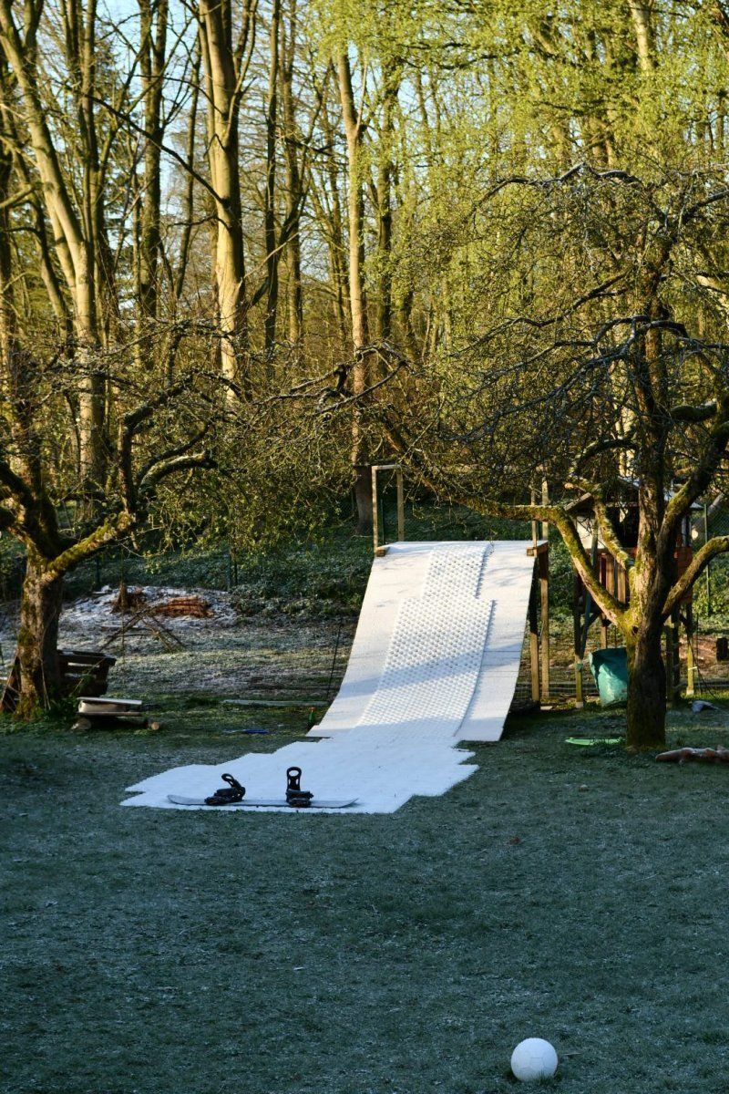 Quickly 15m are built with the sliding mats "Slopetrax". Before that, the snowboarder and "shaper" Tom Avisic built himself a launch ramp with a height of about 2m out of wood. With an angle of inclination of approx. 25%, several meters of wood were then laid crosswise. On it the Slopetrax sliding mats were fastened with wood screws.
