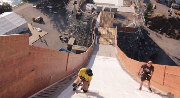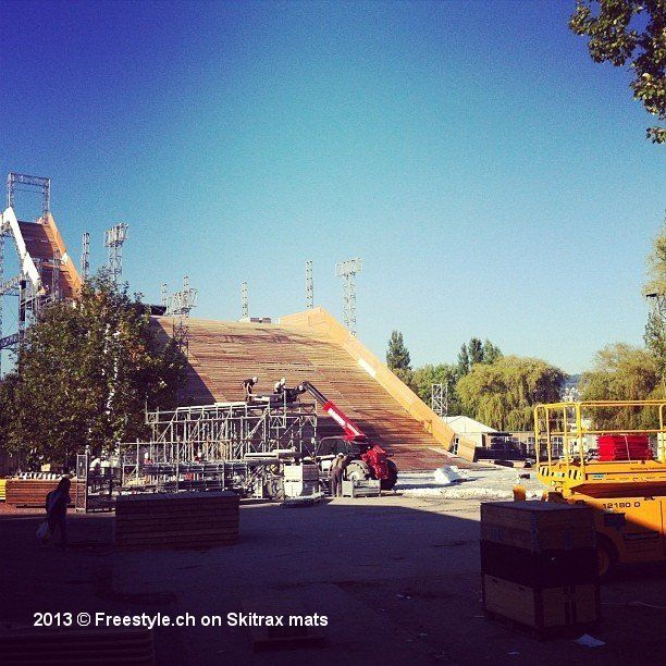 After completion of the 32 m high freestyle jump in the middle of the week, approx. 60 sqm of SlopeTrax sliding mats were laid out on the more than 40 degree steep start ramp, on which the riders could slide if there should not be enough snow. But the mats also serve to give the snow a better grip - which was then produced by the ton in the nitrogen tent on Friday afternoon and distributed over the entire jumping area. Due to the heavy rain, the snow in the start area flowed away, but on the mats the riders were able to ride perfectly.