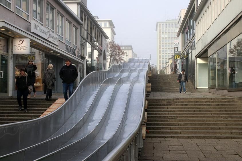 A true fairy tale slide was opened at Christmas Market at the end of November in the German city Kassel. 70m long with 4 lanes side by side, this TÜV-certified slide made of precious metal elegantly pulls itself down the many meeting steps. The rapid wavy constructed track is heavily used by young and old. Top speeds of up to 40 Km/h (25 Miles) are reached on specially designed plastic slides.