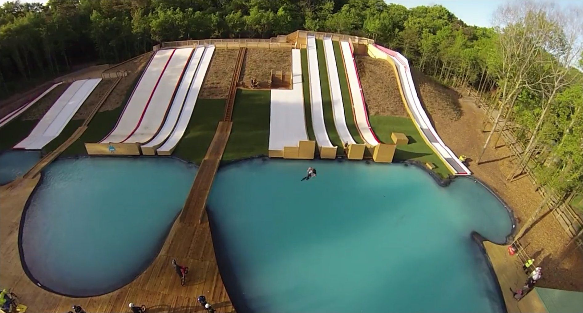 On April 12, 2014, work was completed on the new freestyle & leisure water jump "Indian Forest" in Moutiers on the French Atlantic coast. Three large water basins with a total of 2200 m3 were excavated and developed into a water lagoon. At a height of 10m the launch begins. There you can now jump from beginner to expert on 13 different jumps with different surfaces and jumping angles: with alpine freestyle skis, with BMX bike, with skateboard or with your own body on different rubberized water slides. In addition, there is a climbing garden, children's play center and a paint ball facility.