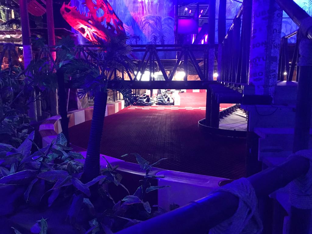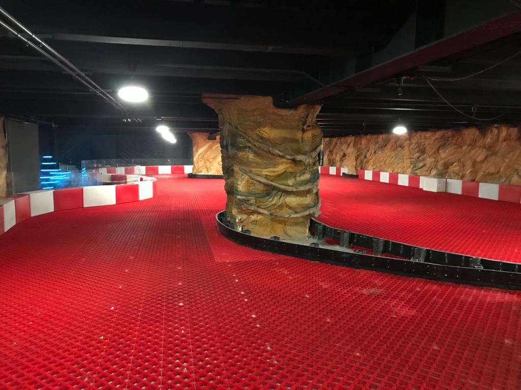 Über eine kleine Treppe geht es in die großen Ice-karting Strecke. Auch hier wurde mit dem Licht eine ganz besondere, mystische Atmosphäre geschaffen. Während auf der Strecke die Karts auf den KartTrax Matten sliden und driften, kann der Besucher auf Holztreppen und -stegen über der Bahn laufen und die Karts von oben betrachten. Die Anlage ist die Attraktion in Mexico City und zieht viele Kart Fans in jedem Alter magisch an.