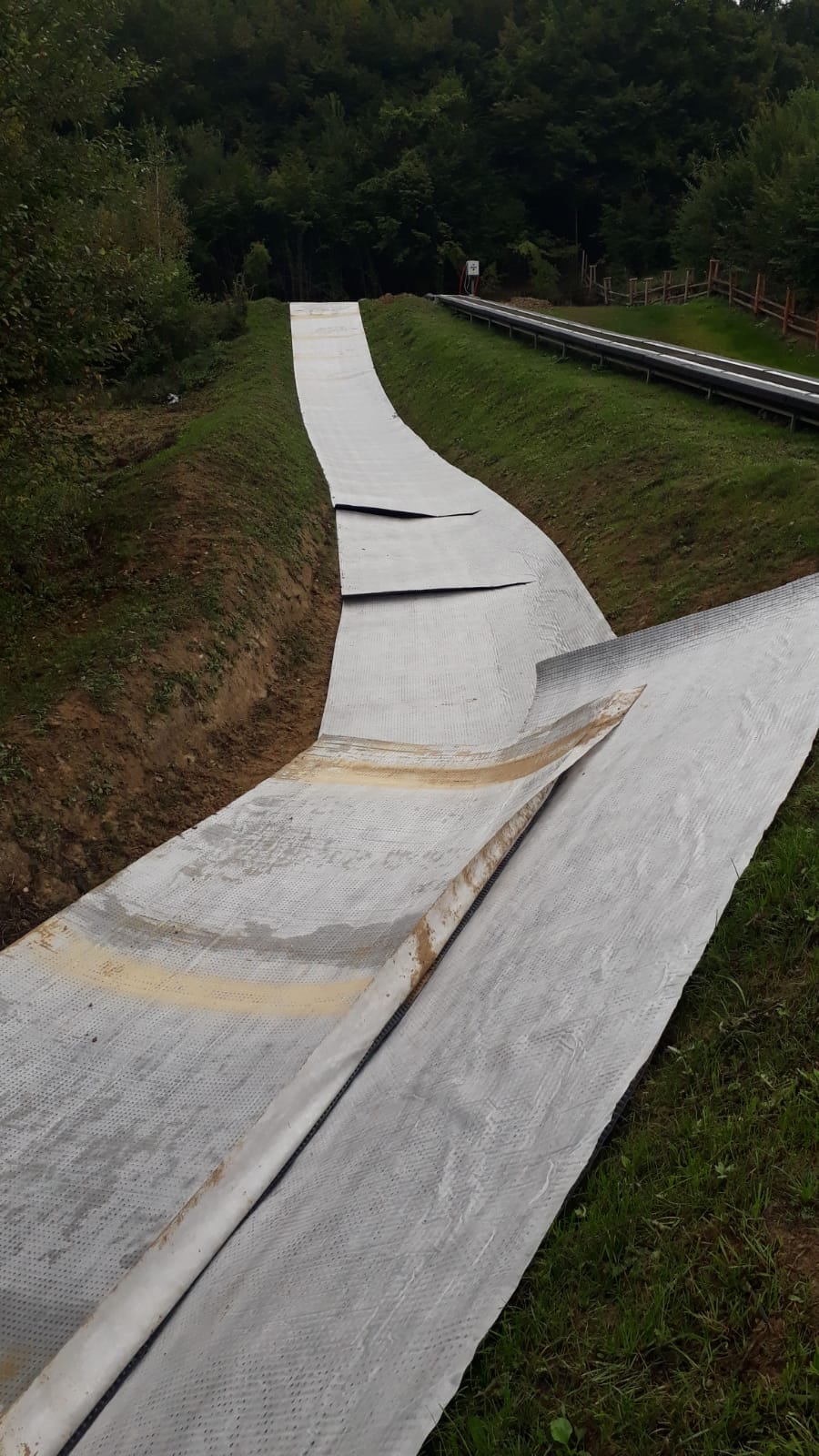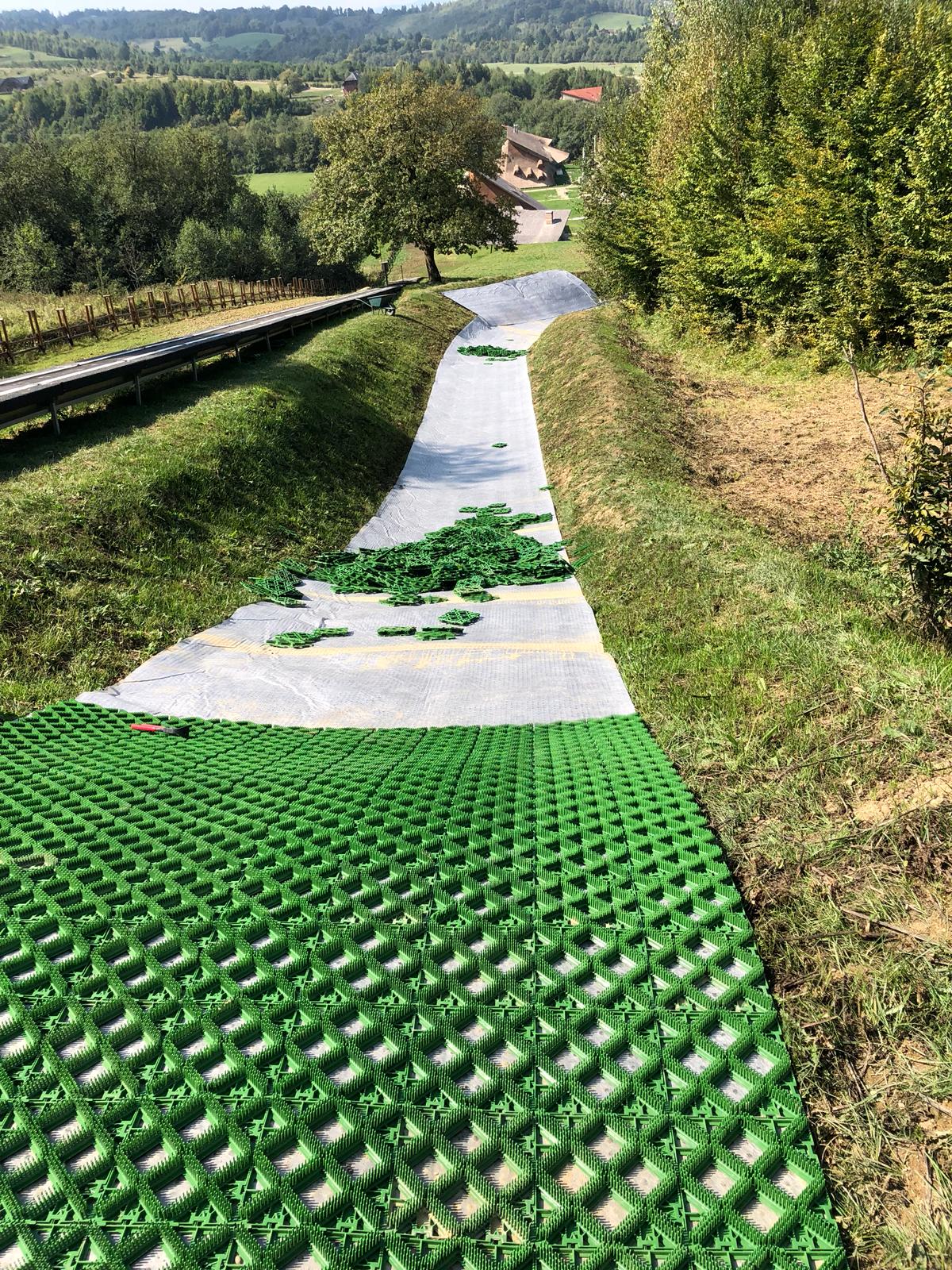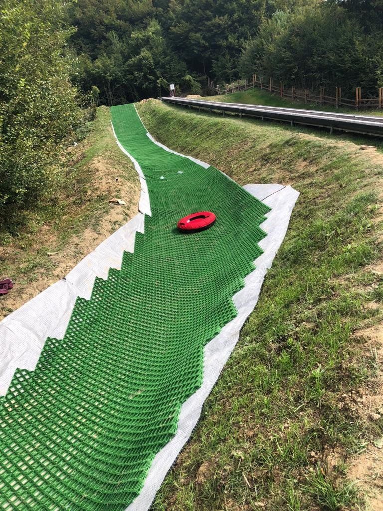 Neben einer professionellen Tubing Bahn mit den Tubtrax-Modulen (M1/M2/M3), besteht auch die Möglichkeit, den Boden wie ein Tubing Bahn mit Kurven selbst zu gestalten! In der Nähe von Brasov wurde eine 150m lange Tubing Bahn in den Boden verlegt. Dazu wurden der Boden mit dem neuartigen "Dry Slope Drainage Fleece" (DSDF) ausgelegt, damit keine Dreck oder keine Steine auf die Rutschfläche kommen. Ein weitere Vorteil des DSDF ist der Abtransport des Regenwassers durch das Drainagesystem.