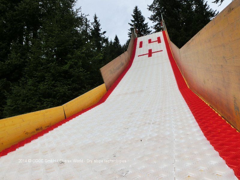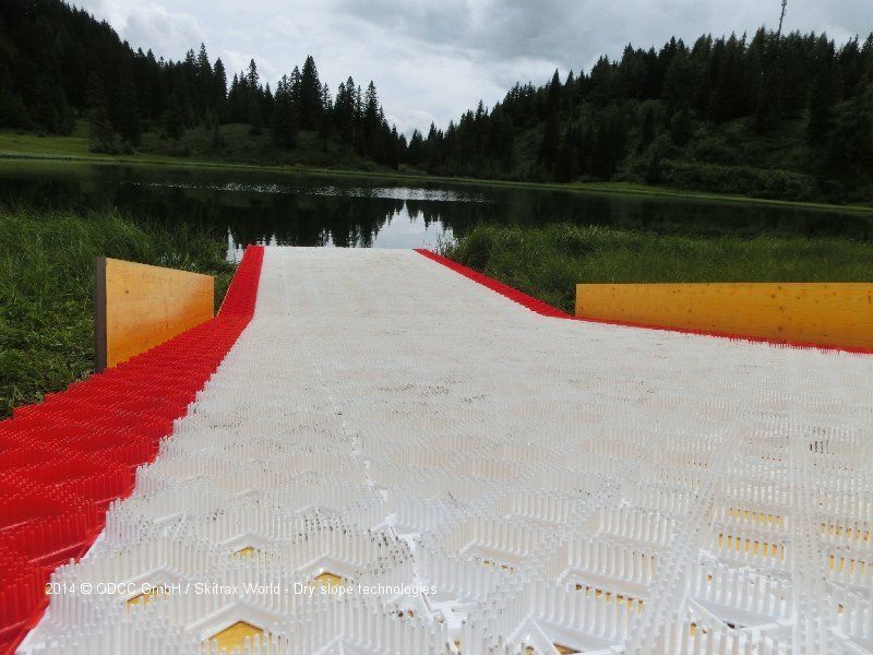 It goes up to a height of 11m. Built on a metal scaffolding, the Watertrax sliding mats are mounted on a width of 3m. Then it's about 20m from the start to the water. The track ends very close to the water surface. Now people with tubing tyres, skis or snowboards can glide down - and glide flat over the water.