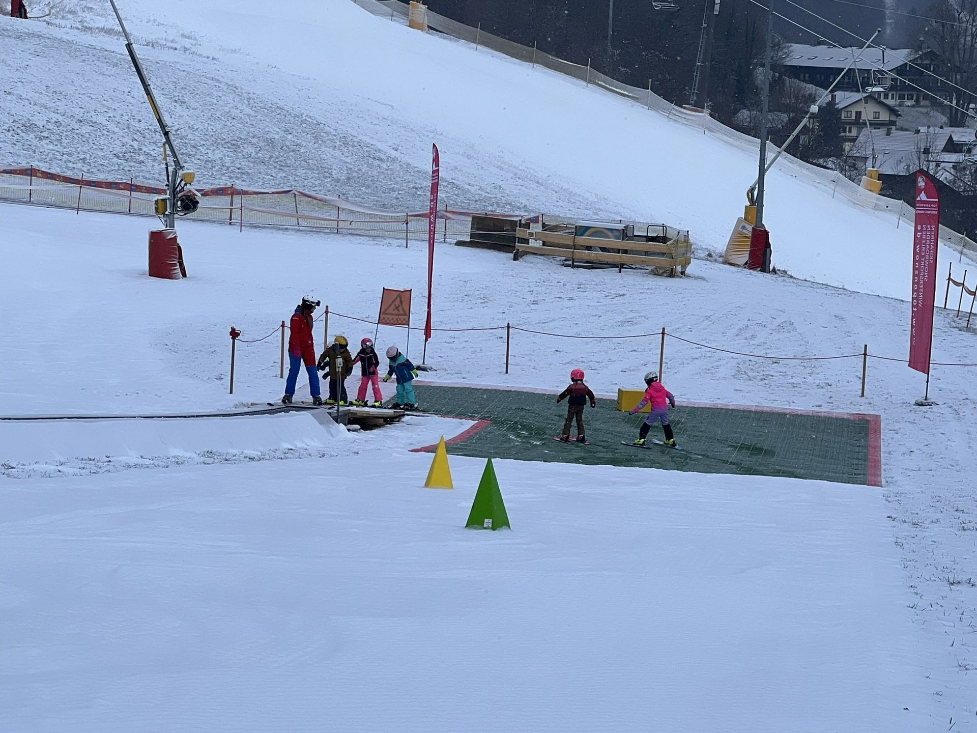 Zumindest im Kinderskibereich im Tal sollte, neben dem Förderband, eine Kunststoffpiste erstellt werden. Dann können sich Skilehrer und die Kindergruppen auf einen spaßigen und (buss)stressfreien Tag einstellen. Sollte dann der Schnee doch kommen, geht die Skischule auf Schnee weiter. Bei einsetzendem Tauwetter wird auf den Matten weiter gefahren.
