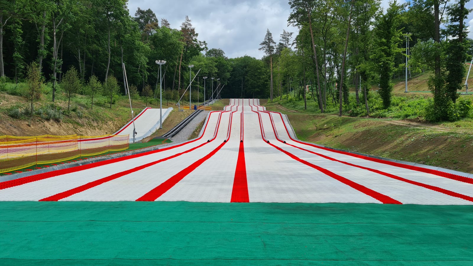 Skitrax World hat die gesamte Ausrüstung für die Installation und den Betrieb der alpinen Mattenskipiste und Tubing Bahn auf 17 LKW geliefert. Dazu gehört das Dry Slope Drainage Fleece (DSDF) für die gesamte Bodenisolierung und Wasserabtransport, 70.000 spezielle Erdnägel zur Bodenbefestigung, die Slopetrax und Tubtrax Kunststoffmatten, Stopping Fleece, 300 Tubing Reifen und das schnelle Gleitmittel Slide Liquid.