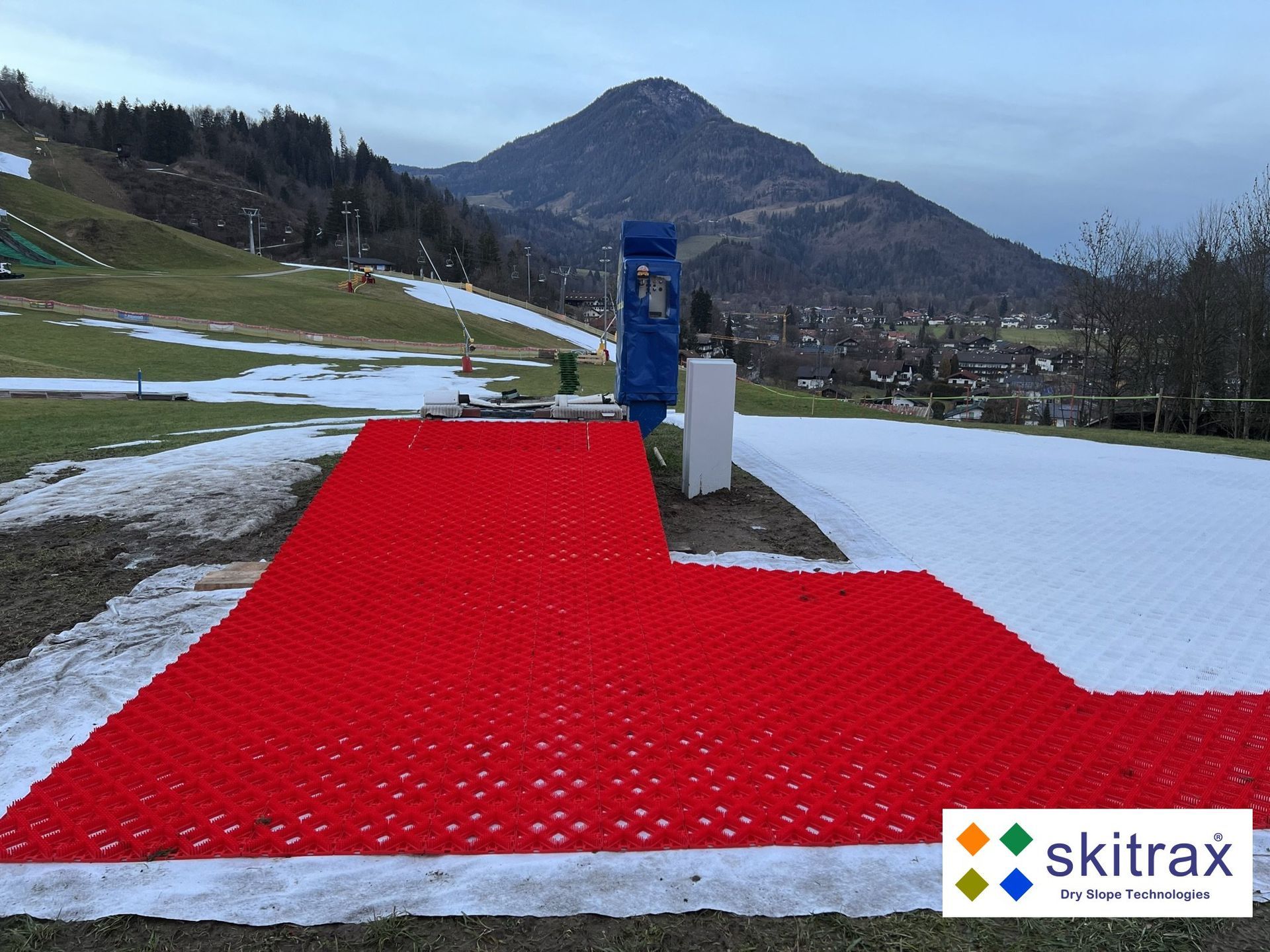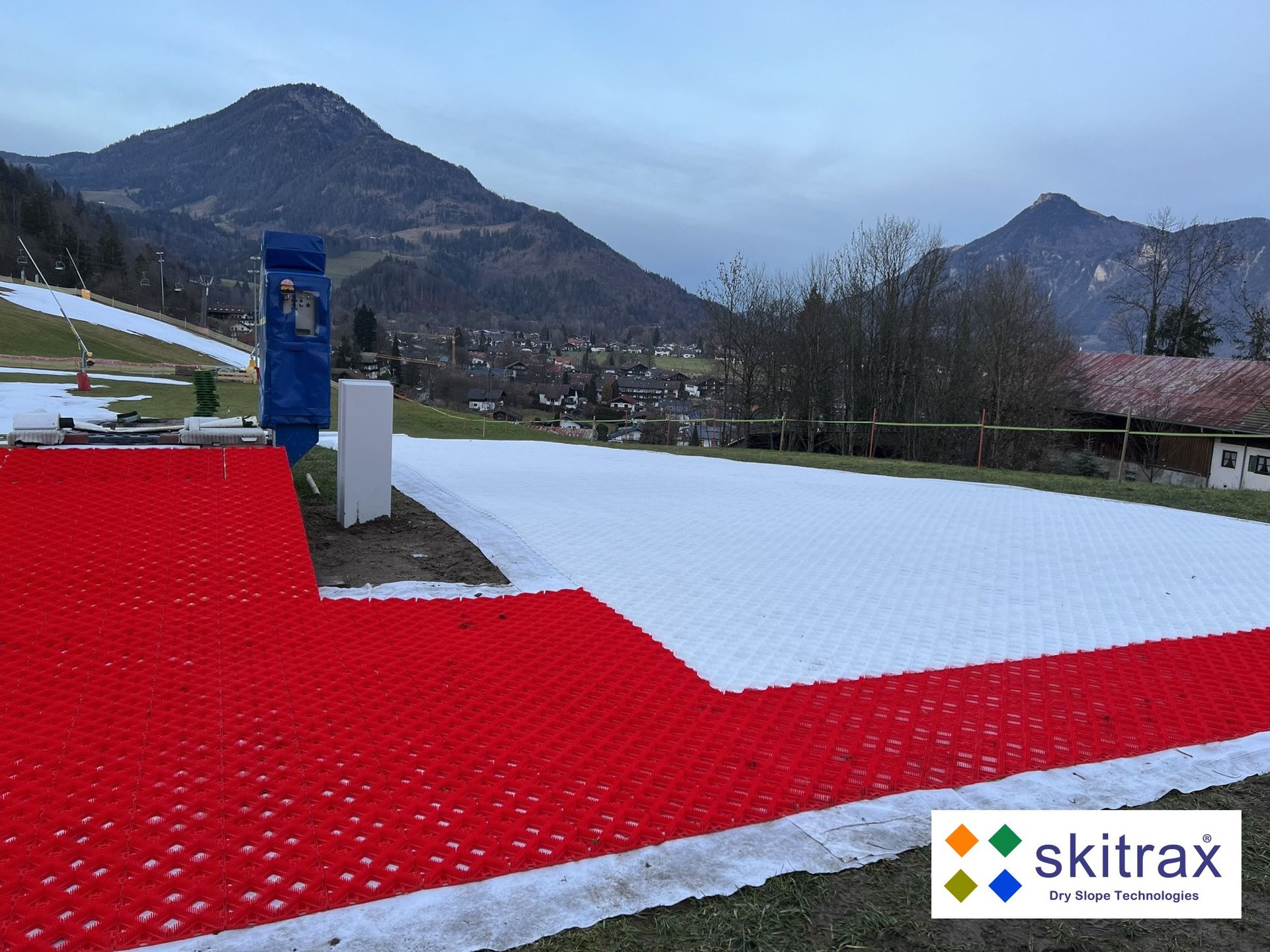 Two conveyor belts and a rope lift are available in the Kinderland - but have also not been in operation since the beginning of the season due to the lack of snow. At short notice, the managing director of Hocheck Bergbahn, Hannes Rechenauer, and the managing director Wolfgang Schmidt of Skitrax World agreed to install an alpine dry slope area by Skitrax World on a 50m-long conveyor belt with Slopetrax sliding mats at the beginning of the new year.