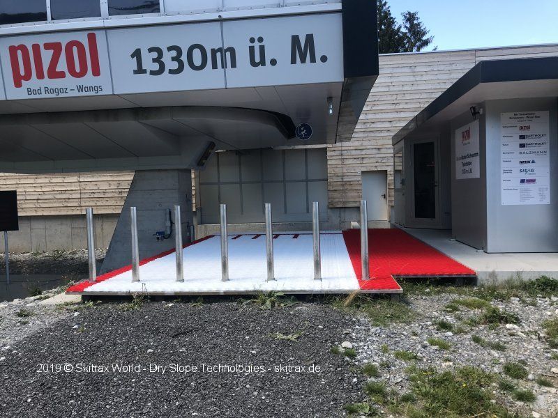 Gleich für mehrere Sessellifte nutzt die Schweizer Bergbahn Pizol die Skitrax Gleitmatten. Insbesondere mit den roten Matten sollten mehr auf den Gefahrenbereich hingewiesen werden. Dies wurde durch rote Streifen bis zum Lifteinstiegsbereich erreicht.