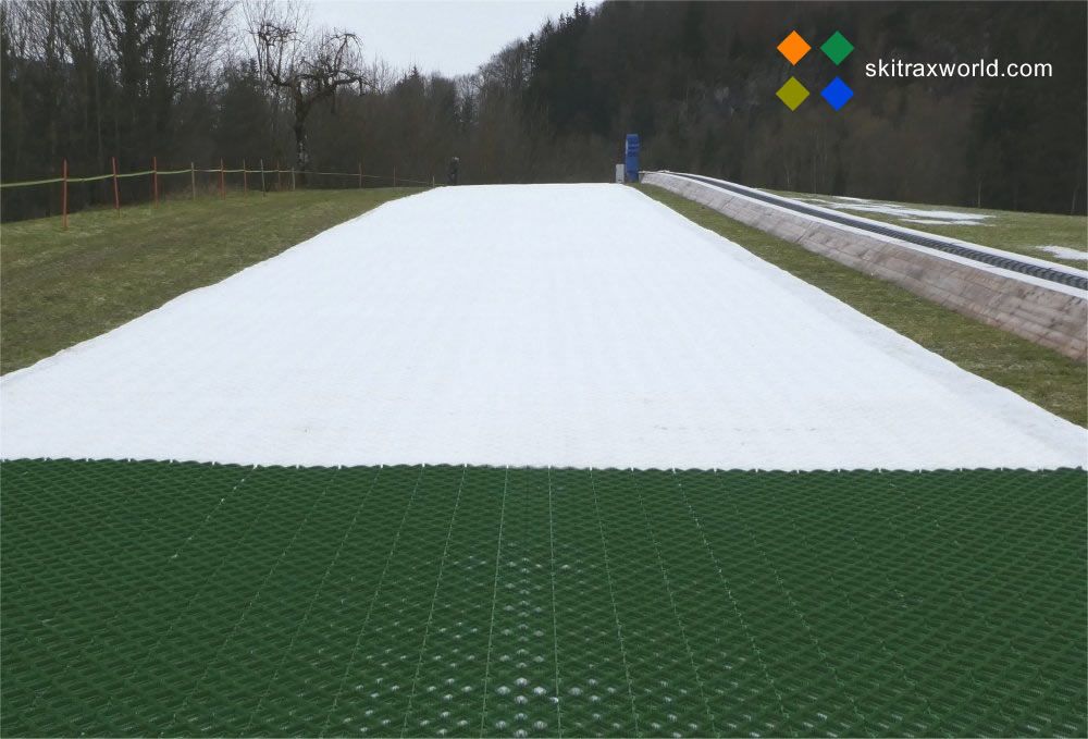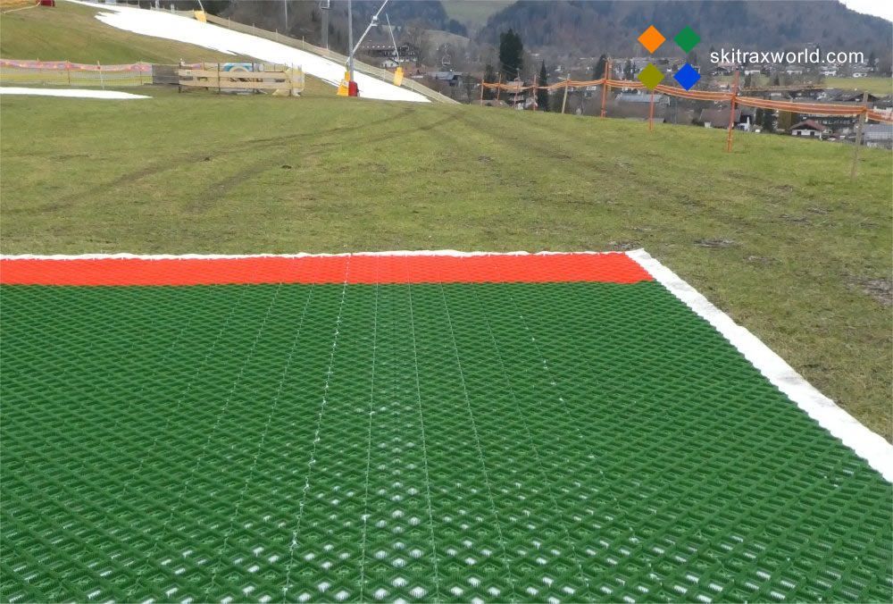 Our Skitrax mats offer an alternative to skiing on snow. It is not intended to be a substitute for snow ski areas. Matted ski pistes are laid because there is too little or no snow to ensure clear skiing. In addition, the mats do not cause any damage to the turf used during the vegetation-free months (October/November - March/April)!