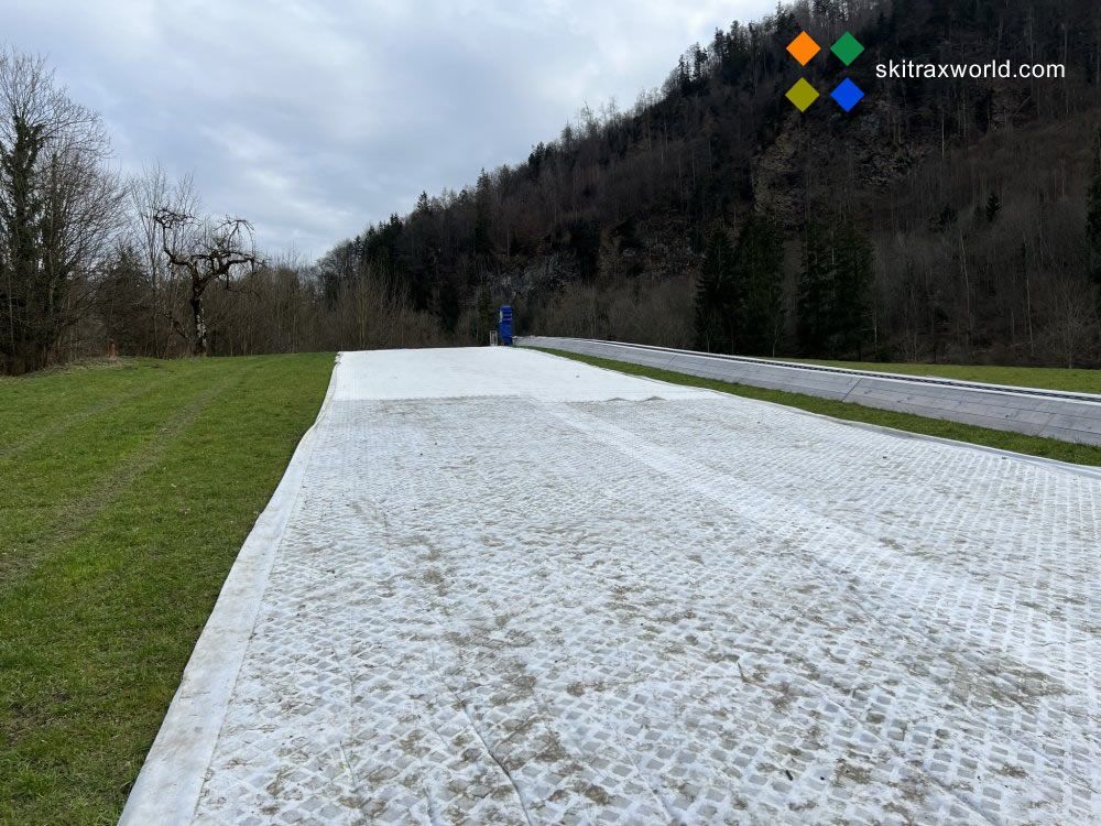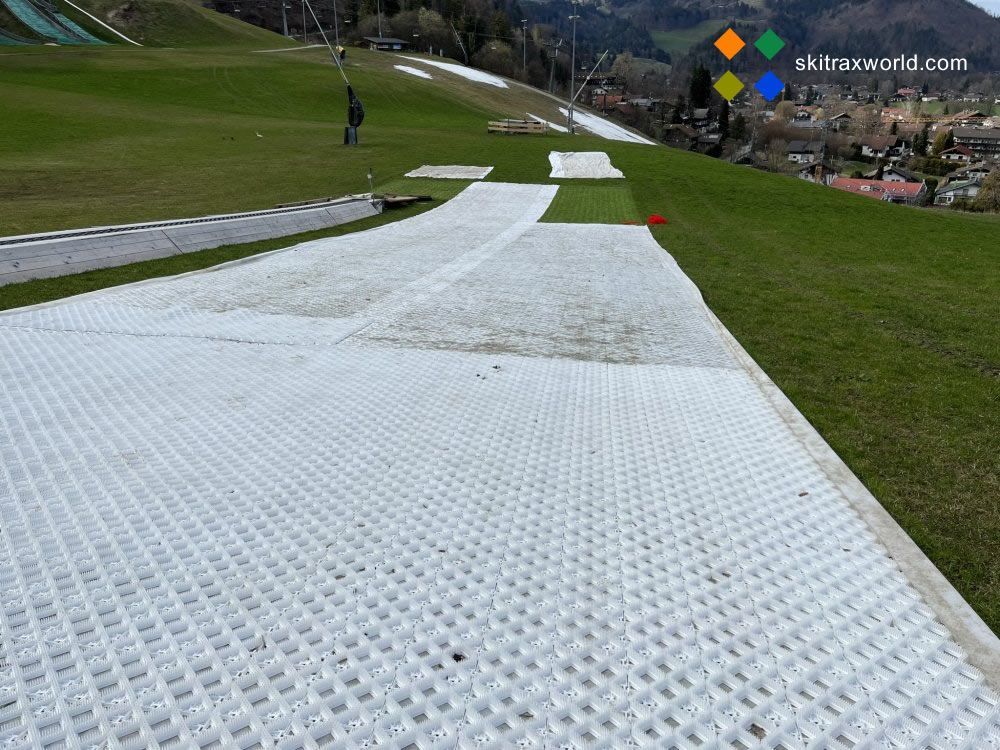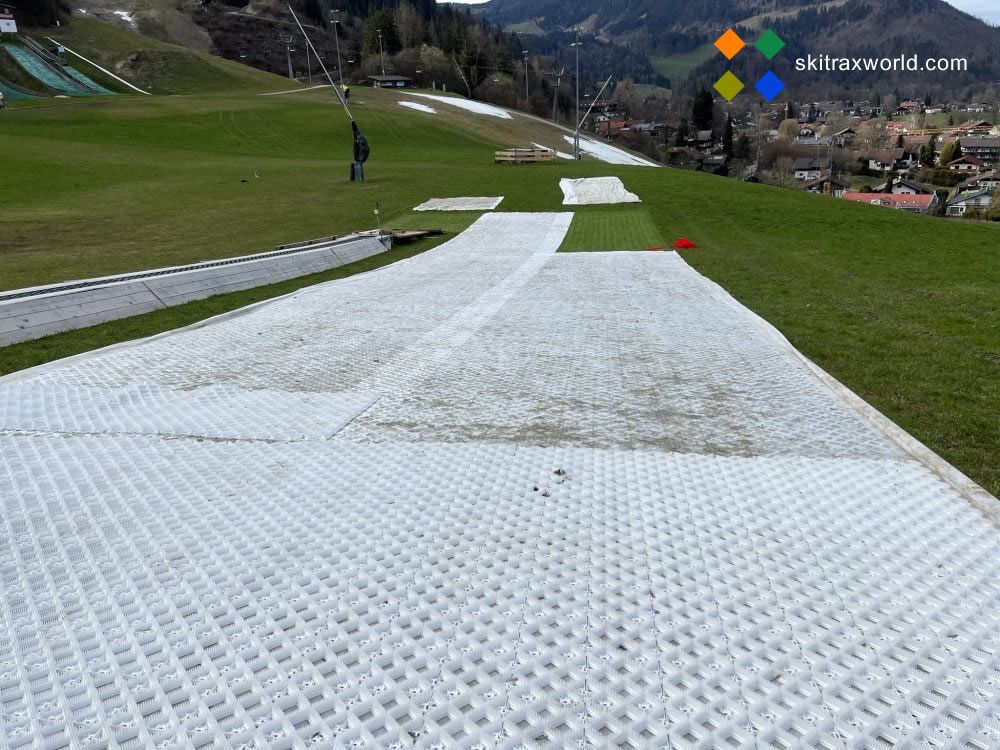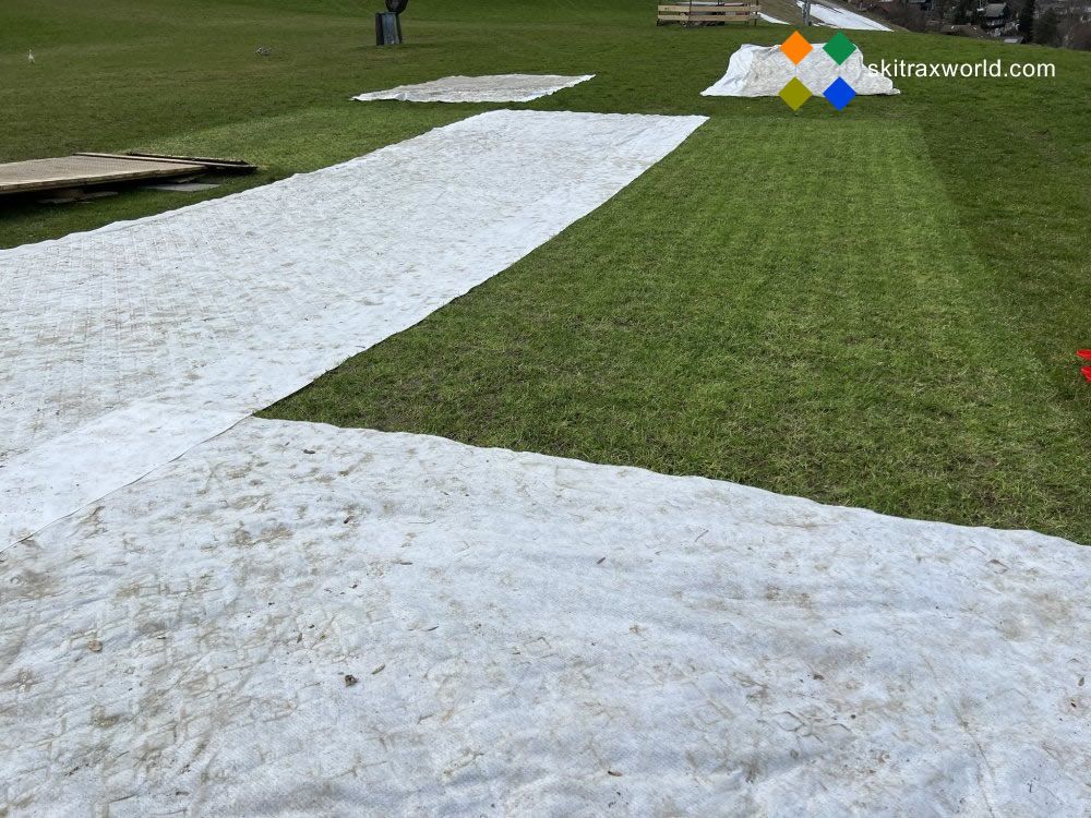 Für die fixe oder temporäre Installation im Sommer wird ein spezielles Bodenvlies in den Rasen gelegt. Es lässt den Rasen durchwachsen und gibt dem Rasen Luft und Wasser zum Wachsen. Dazu blockiert es gleichzeitig Sand und Dreck, damit dieser nicht auf die Matten kommt. Die Skikanten rasieren (und mulchen) dann den Rasen täglich. Somit entsteht eine feste Verbindung zwischen Rasen und Matten, die keine Schäden hinterlässt. (Siehe Fotos unten)
