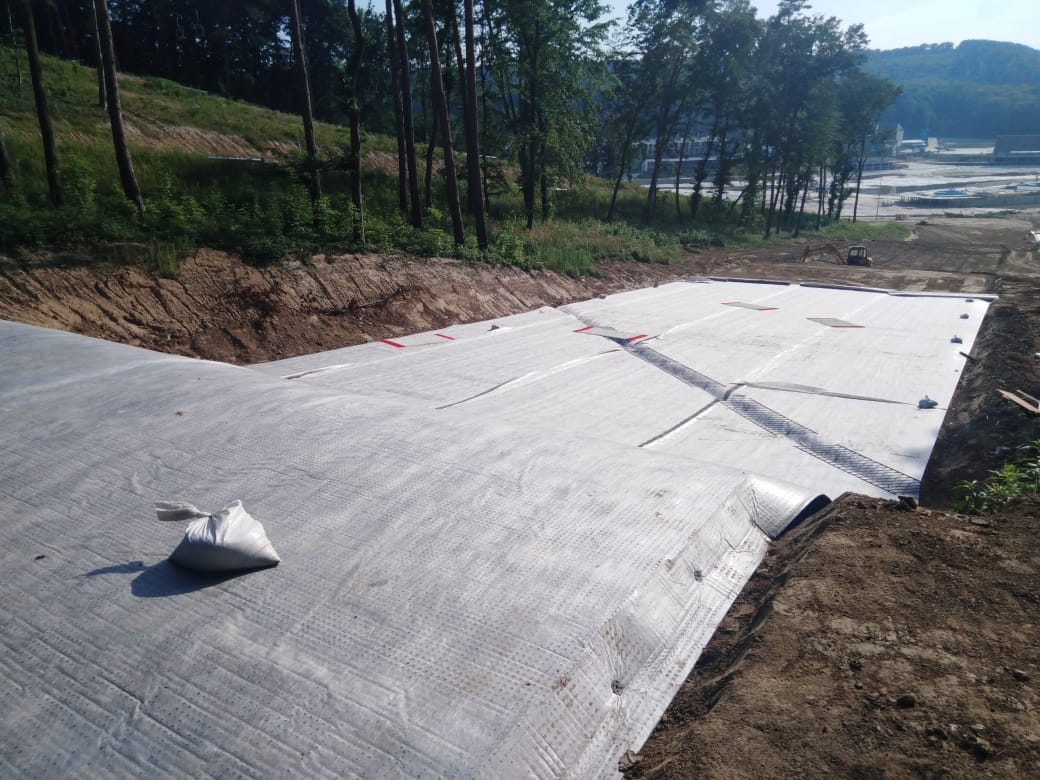 Auf Erdstoffen und anderen Untergründen bleibt das Produkt auch in Böschungsbereichen ohne zusätzliche Befestigung liegen und sorgt durch kleine Kanäle für den Abtransport des Wassers und Microplastic.
