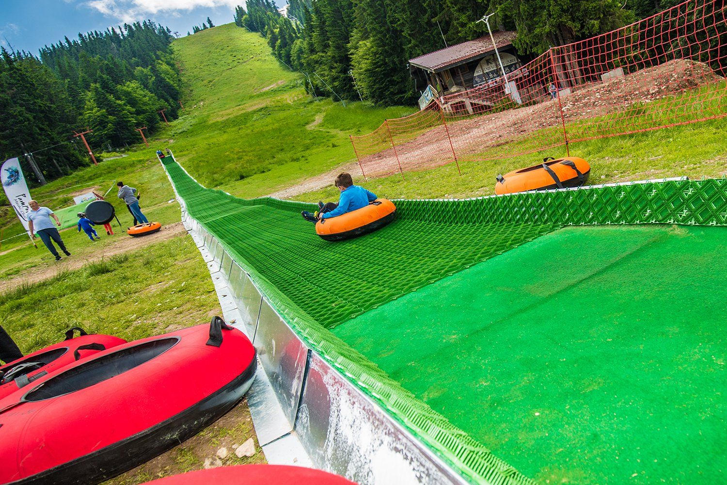 The Epic II tubing tyres can be used on snow in winter and on plastic mats in summer. Using the fast Tubtrax sliding mats and Skitrax tubing tires with HDPE bottom creates the perfect combination for creating a fast tubing track even in summer.