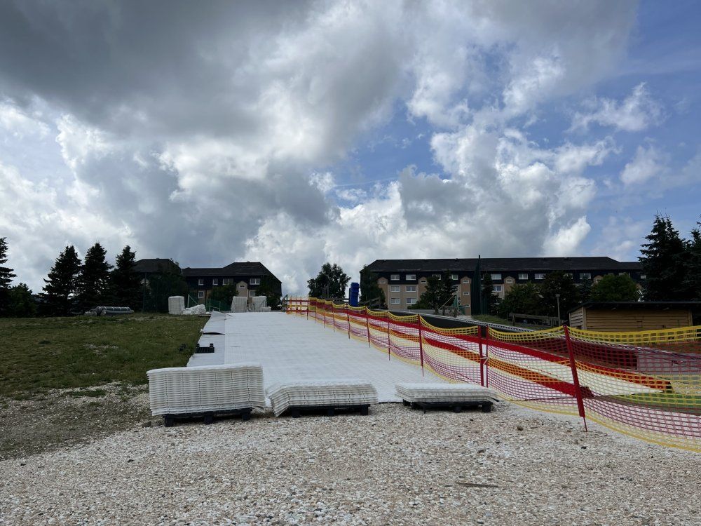 The 4-star Family Hotel Elldus in Oberwiesenthal is already one step ahead of winter. The basis is a 30m long conveyor belt and about 600 m2 of Tubtrax / Slopetrax mats from Skitrax World. Already a hybrid dry ski slope is ready. Next to the conveyor belt, a tubing track with two lanes is operated in summer. The Tubtrax-M2.2 modules have been placed under the mats and the tubing lanes are ready. Next to it, the last mats for the mat ski run are being finished. So that no stones or dirt gets on the mats there, our DSDF (Dry Slope Drain Fleece) was rolled out. Only then the mats are installed on the fleece. This guarantees perfect water drainage.