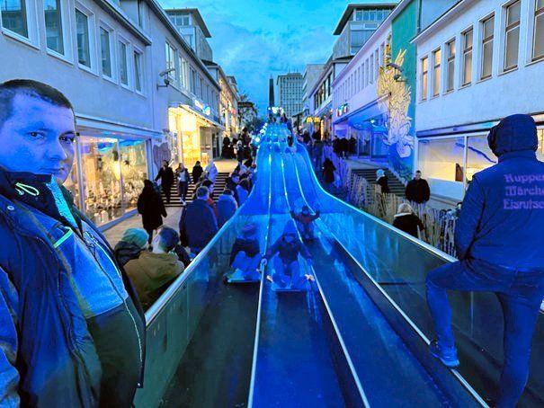 A true fairy tale slide was opened at Christmas Market at the end of November in the German city Kassel. 70m long with 4 lanes side by side, this TÜV-certified slide made of precious metal elegantly pulls itself down the many meeting steps. The rapid wavy constructed track is heavily used by young and old. Top speeds of up to 40 Km/h (25 Miles) are reached on specially designed plastic slides.