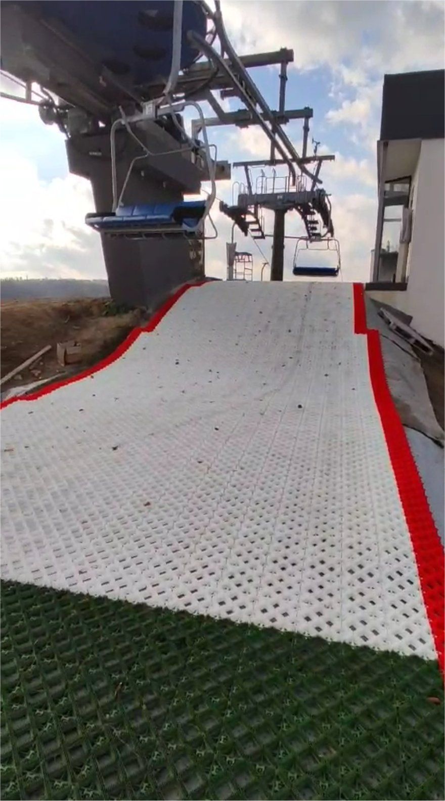 The slope 3 has a double function. It serves as an alpine ski slope for beginners and/or a slopestyle park with obstacles - in summer and in winter. Depending on demand, the entire area can also be used as a tubing track with 6 lanes in summer. To do this, simply pull up the mats marked in red during installation and slide the custom Tubtrax M2.2 side modules underneath and fasten them to the ground - and the summer tubing track is ready. It doesn't get any more flexible than this. The Tubtrax M2.2 modules can be removed just as quickly and there is once again a flat surface for skiing.