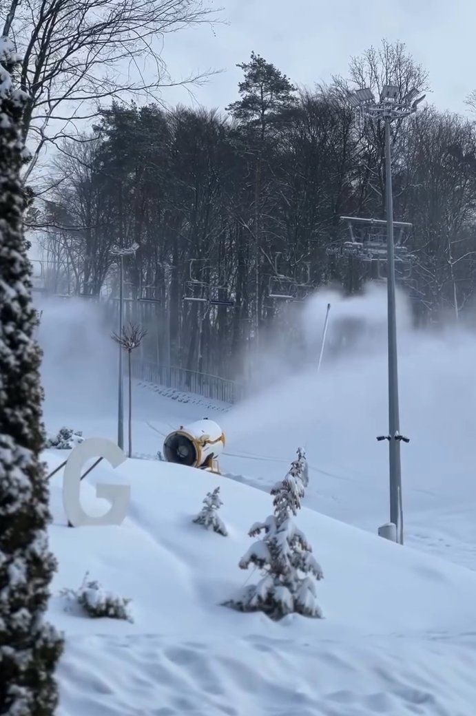Schneekanonen oder Schneelanzen: Diese Geräte blasen bei entsprechender Temperatur Schnee auf die Piste. Behandlung wie bei einem üblichen Skigebiet mit diversen Schneelanzen.
