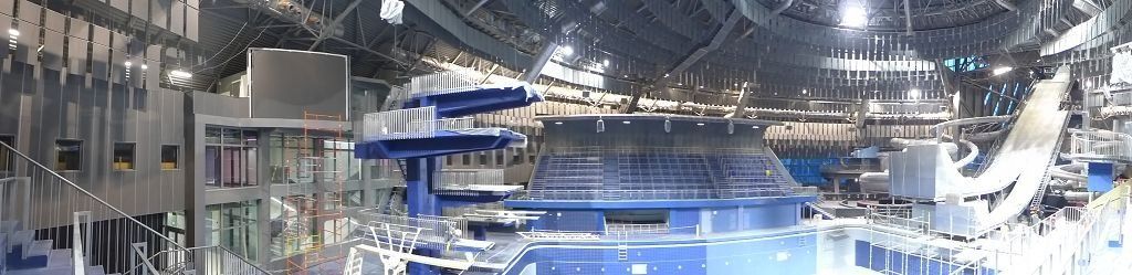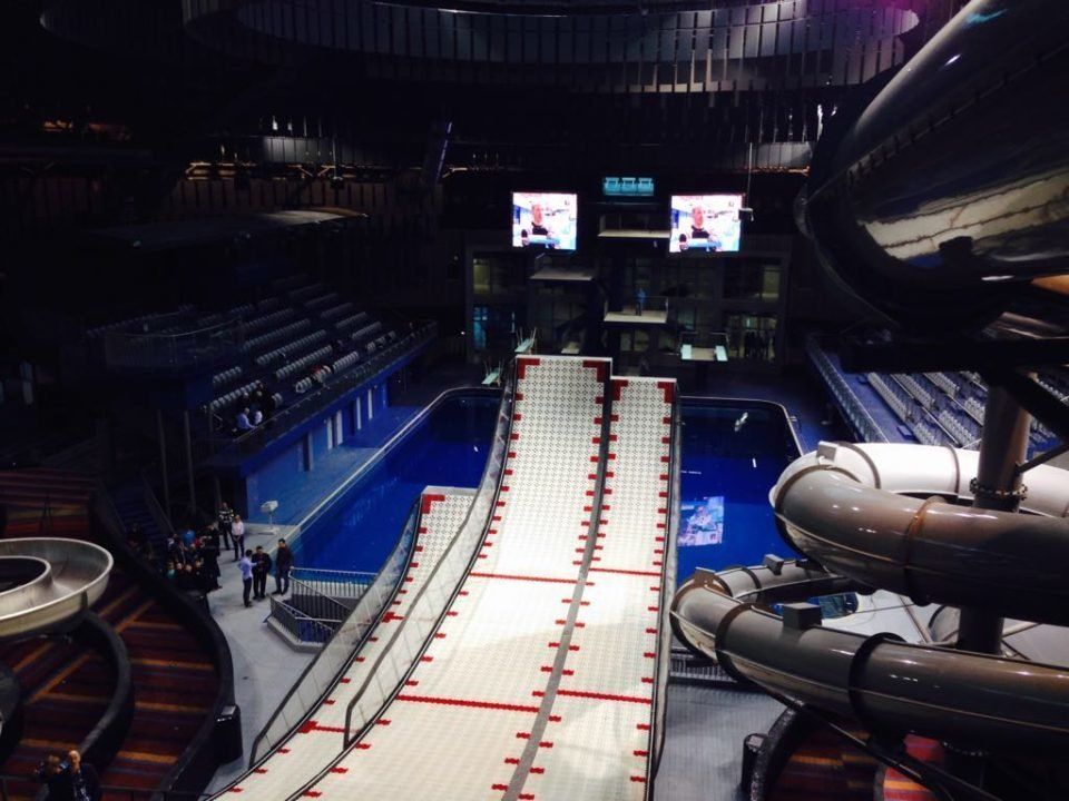 Ein fast 50m hohes, futuristisches Gebäude beinhaltet nicht nur die 35m hohe Freestyle Schanze, sondern auch noch ein Schwimmbad mit einem 10m Sprungturm und einer langen Wasserrutsche.