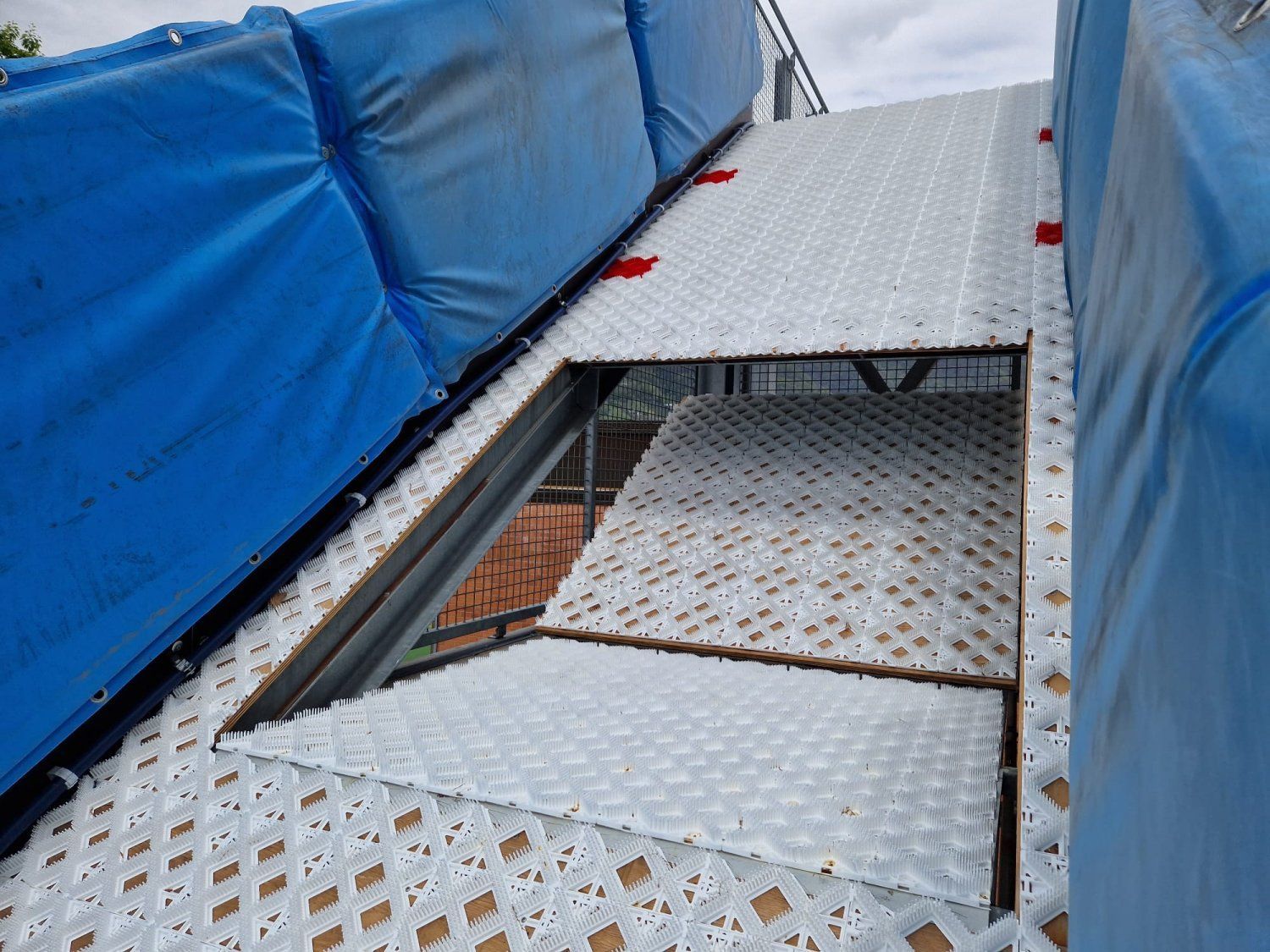 Die Installation der Watertrax Gleitmatten erfolgt durch Befestigung mit Schrauben auf dem Schanzentisch. Eine Wasser-Sprinkler-Anlage am Rand der Anfahrtsspur kann die Lebensdauer der Matten verlängern und den Skibelag schonen.