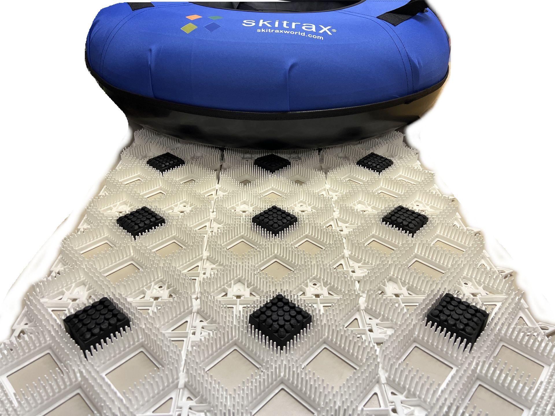 Plug-in-Brake Pads werden einfach in die Rauten der Skitrax Matten gedrückt und halten selbstständig. Je nach Geschwindigkeit des Tubing Reifens können mehr oder weniger dieser Pads eingesetzt werden, um ein früheres oder späteres Anhalten zu bewirken. Diese Flexibilität ermöglicht es dem Betreiber, die Bremsgeschwindigkeit individuell anzupassen.