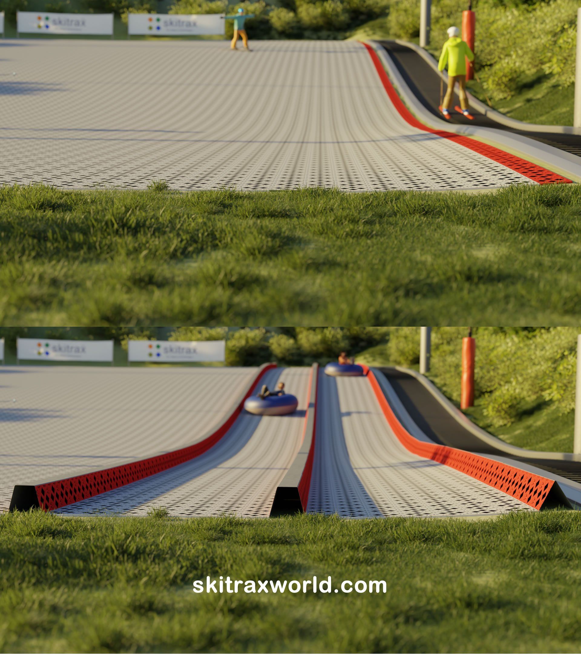 A pista de tubulação possui diversas rotas para uso no verão. Ao remover o Módulo Tubtrax 2.2. Isso cria uma superfície plana onde as trilhas dos tubos podem ser modeladas com neve no inverno. Na primavera os módulos serão integrados novamente e a pista de tubing de verão estará concluída.