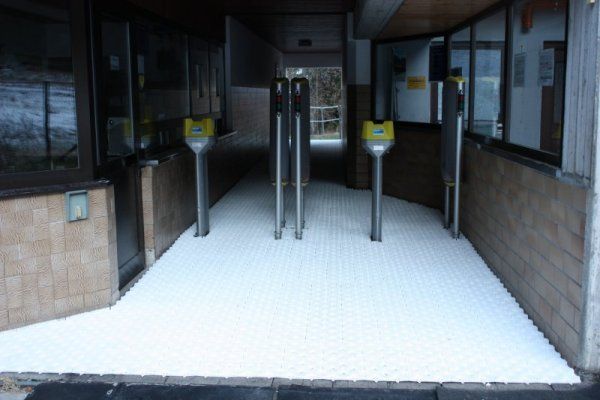 Multe zone de schi din întreaga lume folosesc covorașele noastre pentru intrări, ieșiri de teleschiuri, piste de lift, zone de transfer și în tuneluri de legătură.Asamblate rapid, covorașele pot fi așezate drept sau chiar curbat, în funcție de locația intrării liftului. Prin așezarea covorașelor de alunecare, este nevoie de mai puțină zăpadă și mai puțină muncă în aceste zone cu servicii intensive. Pietrele mici, mucuri de țigară, gumă de mestecat, sticlă spartă etc. cad în sistemul de diamant și nu deteriorează suprafețele de rulare ale schiurilor sau plăcilor.