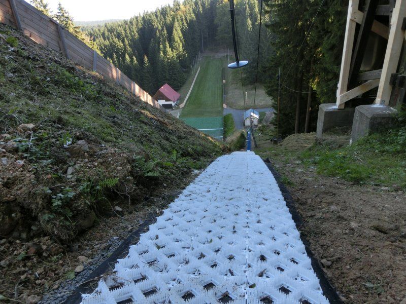 Steep drag lift lanes, even of several hundred meters in length (for example, mats to 1.70m x 2.00m), a fleece is first laid out in the lift lane length. Then the mats are assembled to the desired length and width and stacked on appropriate wooden pallets and brought to the lift line. There, the mat modules are placed one by one in the lift line, connected with cable pictures and fastened to the ground with ground nails. At the end of the winter season, the cable ties are cut again and the mat modules are placed back on the pallets - for overlaying in the summer. In late autumn, the laying starts all over again.