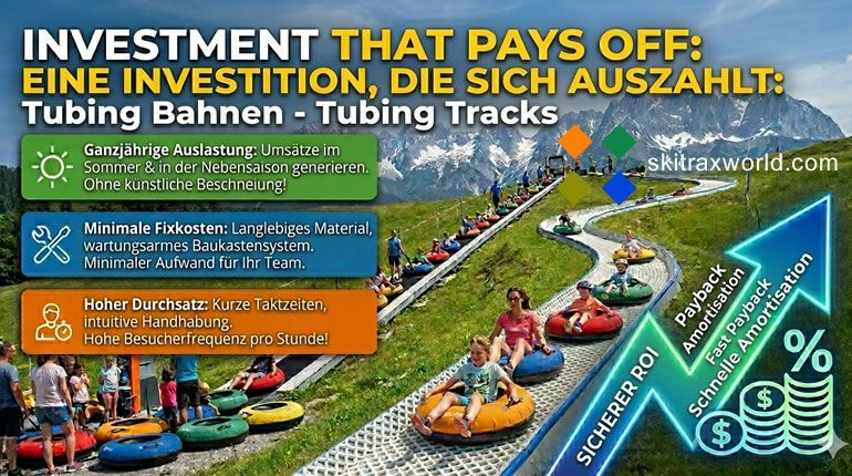 Mit unseren innovativen Tubtrax Modul Tubing Bahnen, bieten wir professionelle Lösungen für kreative Tubing Bahnen mit einer oder gleich mehreren Spuren - natürlich auch mit Kurven und unseren Hartboden (HDPE) Epic Tubing Reifen.