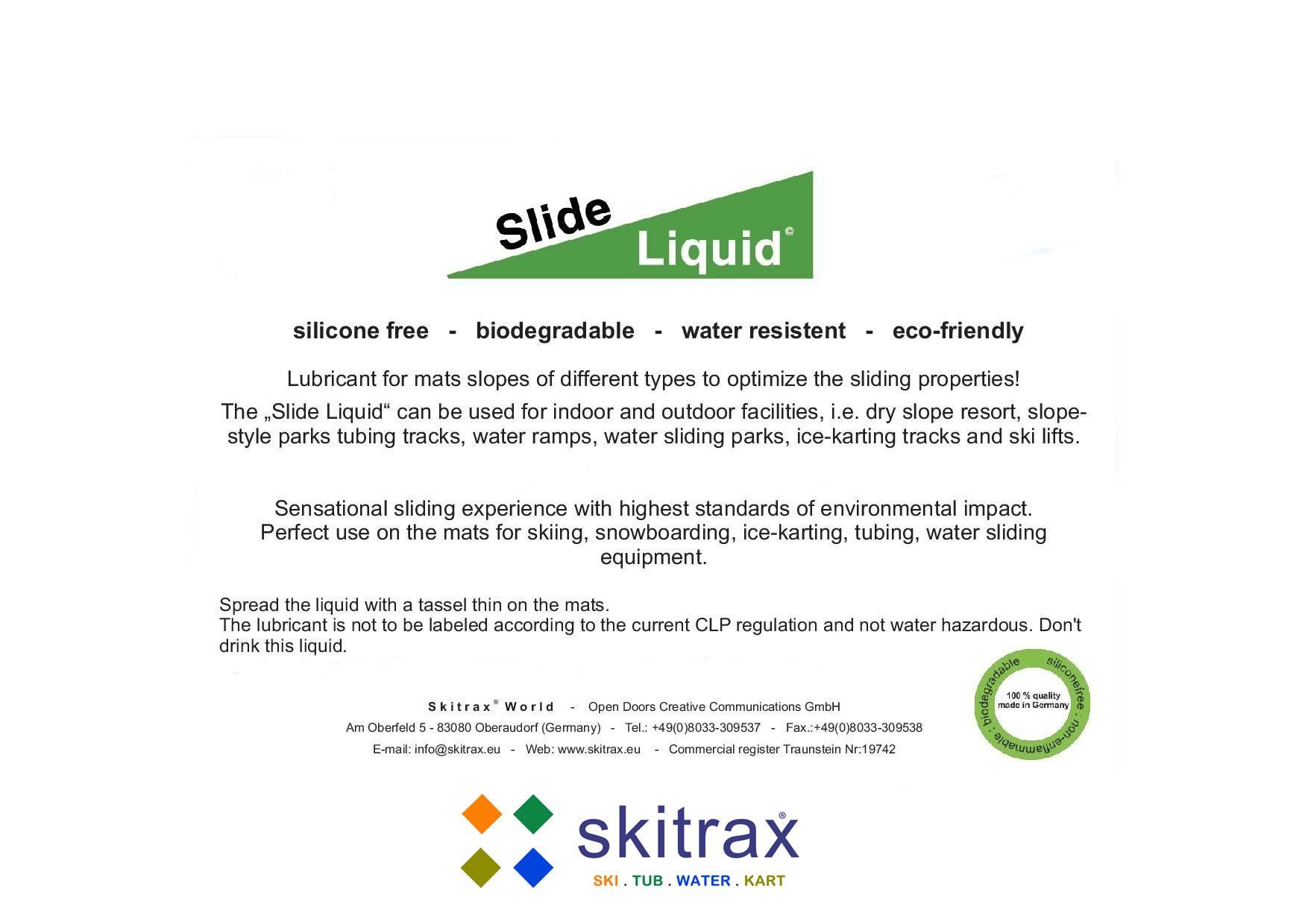 Slide Liquid is an environmentally friendly lubricant for the operation of Lift Zones, tubing tracks, alpine dry ski slopes and ice karting courses. Especially in the summer of 2022 it has been shown that the outside temperatures even reached towards 40 degrees. Friction is created by the contact between skis and/ or tubing tires or karts with the sythetic mats. Friction generates heat and leads to abrasion. To reduce this abrasion significantly, our eco-sliding agent Slide Liquid is used.