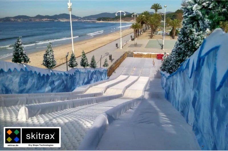 The organizer "Ice World" from Bogota (Colombia) brings a winter wonderland with a large 40m long tubing track to the beach of Colombia. Using 20 Epic Tubing tires, beachgoers can slide rapidly down three lanes of Tubetrax mats.
