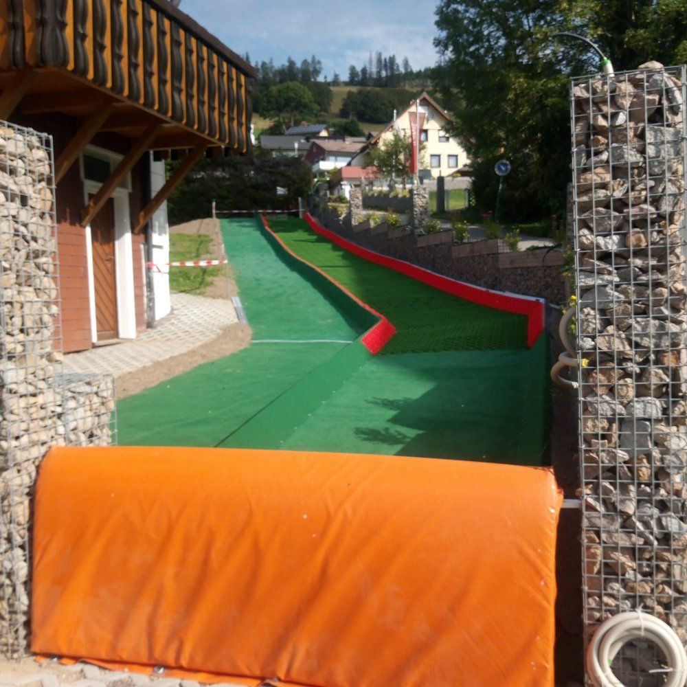 Kaum zu glauben was aus einem kleiner Vorgarten ohne Mauer alles gemacht werden kann. Der Geschäftsführer des 4 Sterne Hotel Engel, Herr Alfred Bloch, hatte diese Idee, den Platz für eine Kinder Tubing Bahn zu nutzen. Erste Planungen wurden erstellt und heraus kam eine 30m lange Tubing Bahn mit einer kleinen Kurve am Ende der Strecke. Es wurden die Tubtrax-M2.1 Module genutzt. Ein Fleece deckt den Boden ab und darauf wurden die Tubtrax Matten mit speziellen Erdnägeln befestigt. Damit die Kids wieder zum Start kommen, wurde ein Fleece Teppich ausgelegt, auf dem die Kinder die Epic tubes mühelos nach oben ziehen können - auf zur nächsten Fahrt.