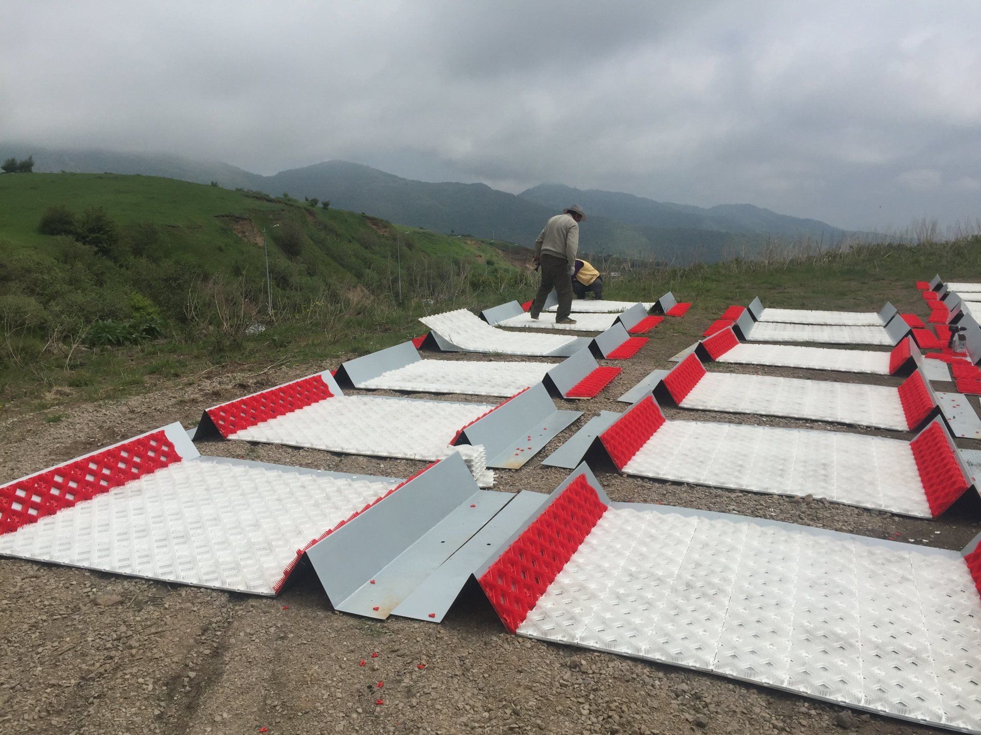 Als ergänzende Ausrüstung kommen hinzu: Gleitmittel Slide Liquid, Dry Slope Dainage Fleece (DSDF) und speziell gedrehte Erdnägel, die auch über Jahre noch fest im Boden sitzen.