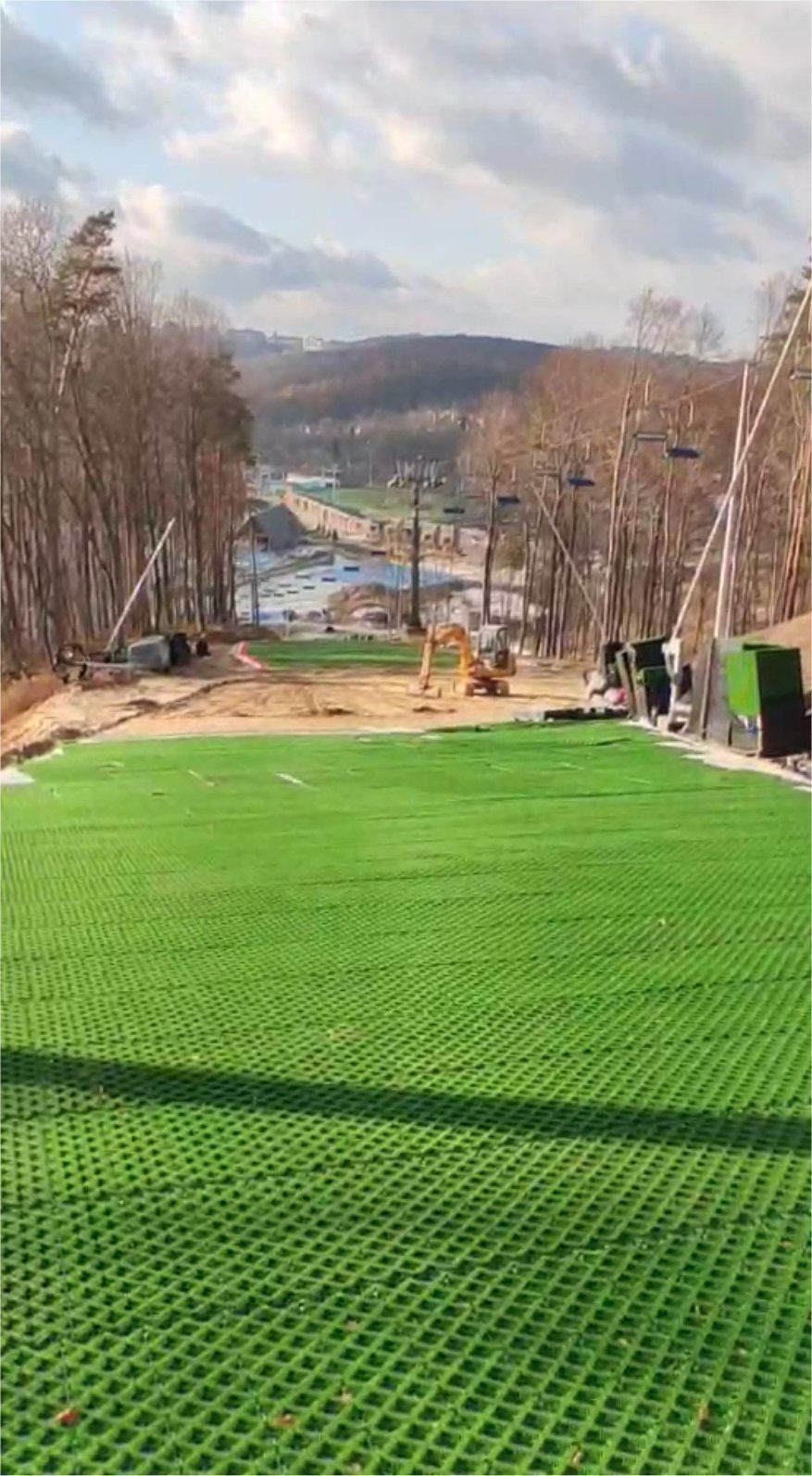 It was already an ambitious plan to build the biggest mat ski slope and tubing track in Europe within about 6 months. Everything was to be ready by the time the first snow came in December. A total of 15 truck loads brought all the material to Lviv (Ukraine). Almost 400,000 pcs. Tubtrax and Slopetrax sliding mats were delivered. Additional tons of drainage fleece (DSDF) for wastewater control, stopping carpets for the tubing lanes, over 70,000 soil nails for ground stabilization and 300 EpicTubing tires.
