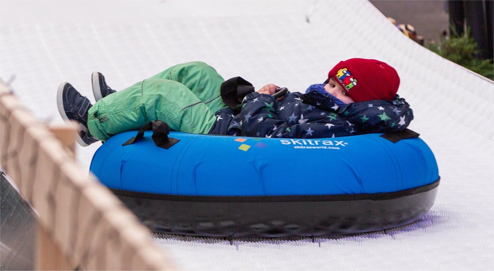 Nun wird diese "Allwetter Tubing Bahn" auf 100m Länge ausgebaut. 54 Tubtrax-M1 Seitenmodule sorgen für eine stabile Fahrt mit den Tubing Reifen auf den Tubtrax Gleitmatten. Egal wie die Wetterbedingungen in der Weihnachtszeit sind, der Rutsch Spaß ist immer gewährleitet.